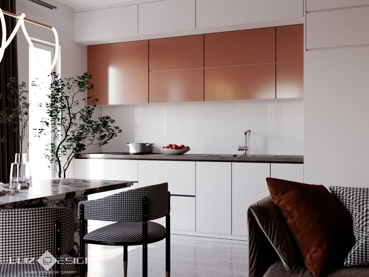 In zona bucatariei este folosita pacare cu efect de marmura cu venatura gri. Parchetul este in nuanta nuc dispus in zona livingului si dormitorului.