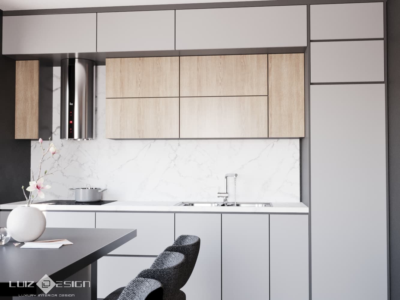 In zona bucatariei este folosita pacare in nuanta de gri deschis rectificata. Parchetul este in nuanta stejar inchis dispus in zona livingului si dormitorului.